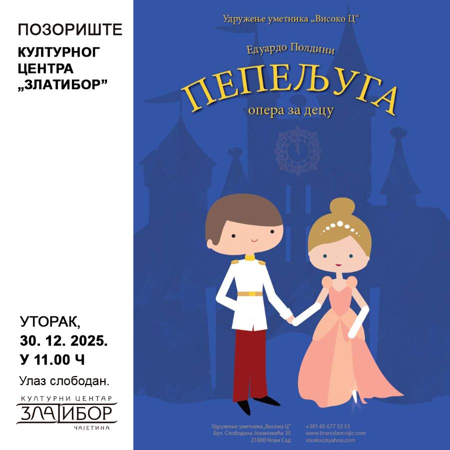 Удружење уметника Високо Ц из Новог Сада извешће у уторак, 30. децембра, оперу за децу Пепељуга у Културном центру на Златибору, са почетком у 11 часова.