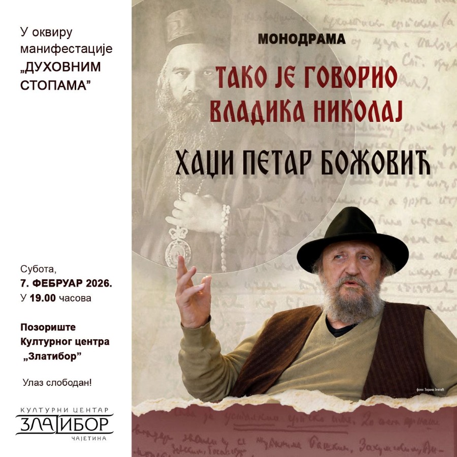 У суботу, 7. фебруара, у 19 часова, у оквиру манифестације „Духовним стопама” Хаџи Петар Божовић извешће монодраму „Тако је говорио владика Николај”.