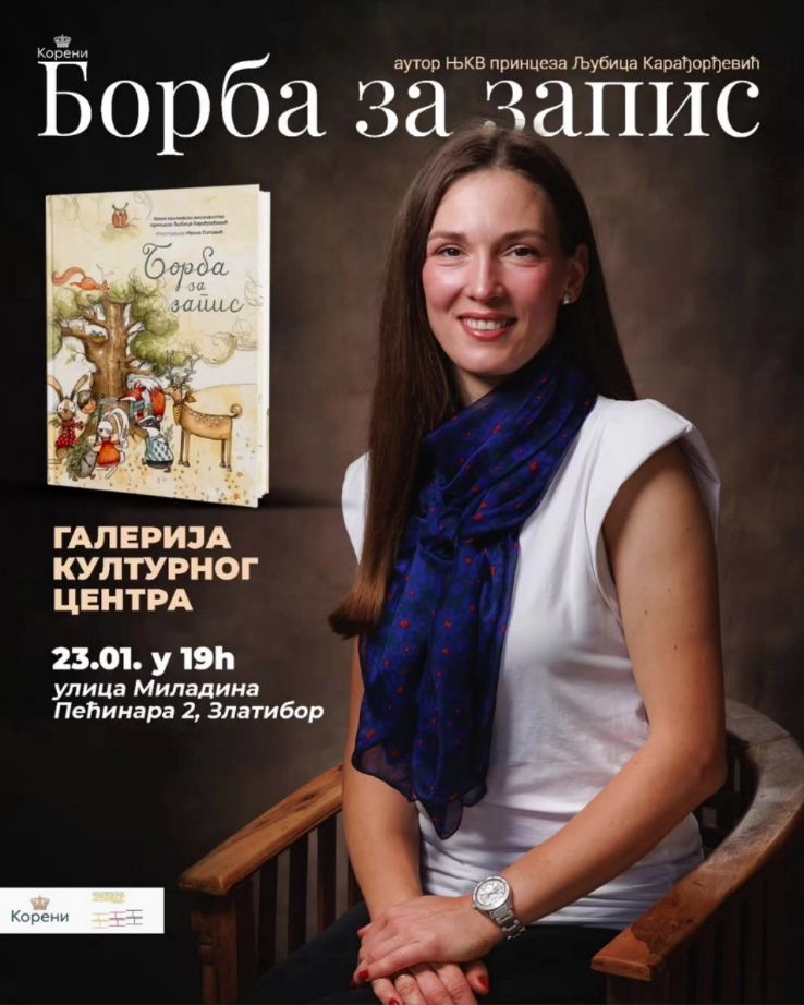 Њено Краљевско Височанство Љубица Карађорђевић представиће своју књигу ,,Борба за запис'' у петак, 23. јануара, у 19 часова, у Галерији Културног центра на Златибору.