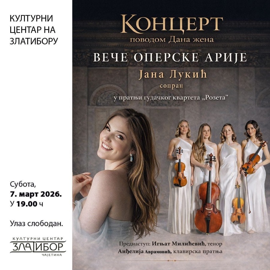 У суботу, 7. марта, у 19 часова, а поводом Дана жена, Културни центар организује вече оперске арије. Наступиће Јана Лукић, сопран, у пратњи гудачког квартета „Розета”. Изводиће познате српске песме и оперске арије.